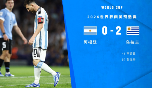 北京時間11月17日08:00,世預(yù)賽南美區(qū)第5輪,阿根廷主場迎戰(zhàn)烏拉圭,上半場努涅斯低射造險,阿勞霍爆射破僵局,半場結(jié)束,阿根廷0-1烏拉圭。下半場梅西定位球中框,努涅斯單刀鎖定勝局,最終阿根廷0-2不敵烏拉圭。